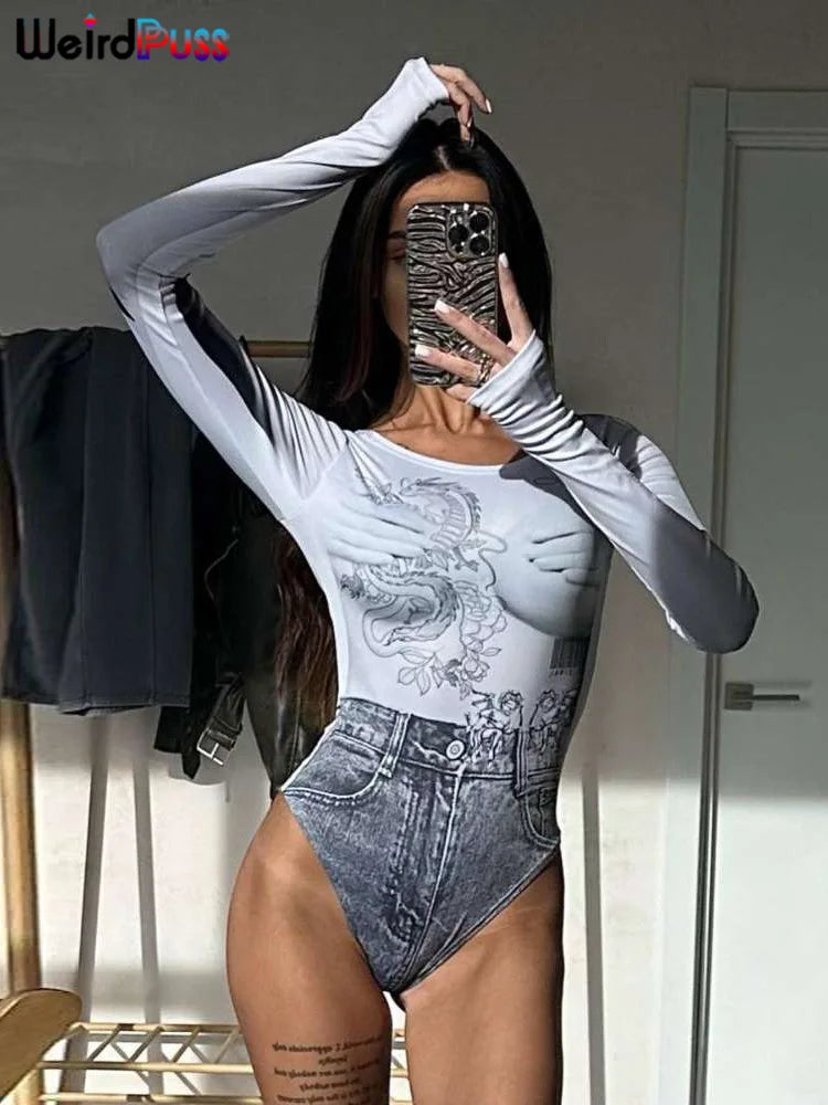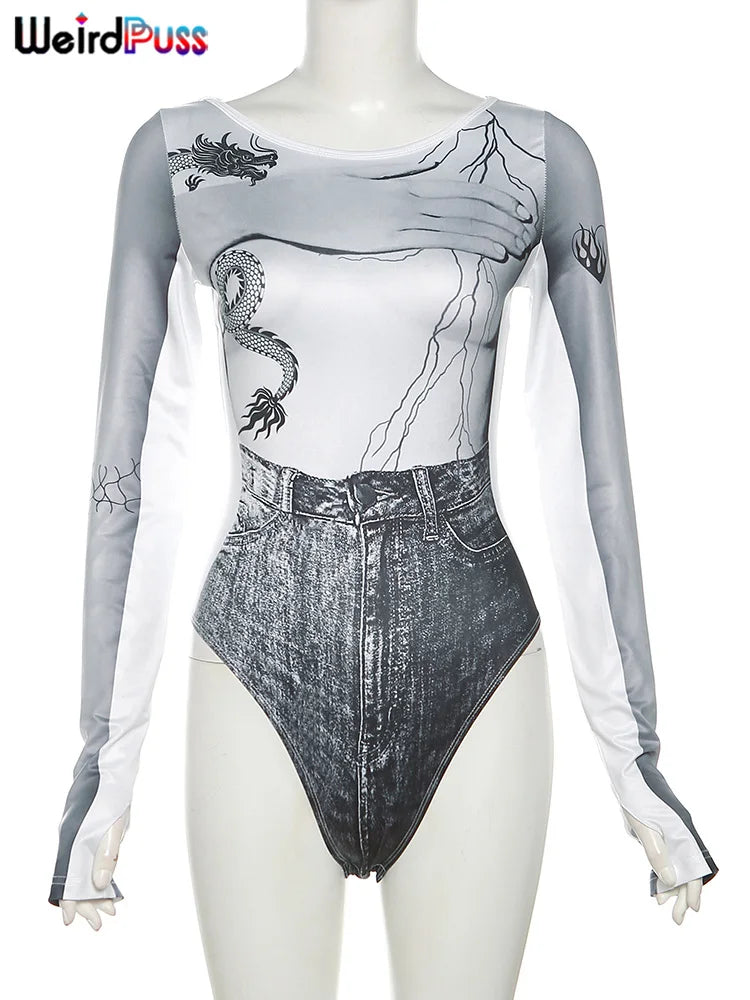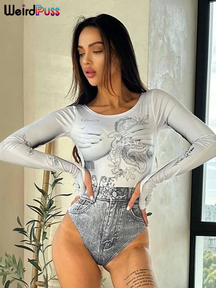 Discover the Body "Wild Dragon" for a definite Gothic look with a touch of Y2K nostalgia. This long-sleeved bodysuit with a round neckline is a great piece for anyone looking to emphasize their character while remaining elegant. It features a bold monochrome print with an oriental dragon and tribal motifs that express a rebellious and wild spirit. The fitted silhouette and elastic material ensure comfort and freedom of movement, allowing you to dance the night away during club visits. The bodysuit pairs wonderfully with a high-waisted skirt or denim jeans, as shown by our model. Make a statement with this standout piece of alternative fashion that will make you the queen of the night and the high street trends of the autumn season.