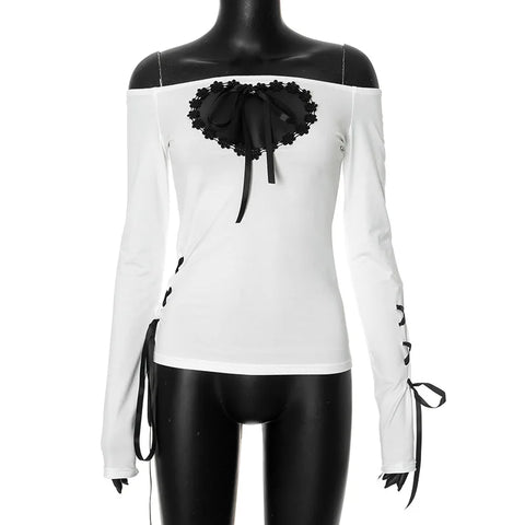 The irresistible world of Y2K style with our long-sleeved top featuring a heart cutout in bright white! A delightful mix of romance and a daring pattern that accentuates the delicate heart cutout in the front, surrounded by delicate black embellishments. The contrasting black chain on the inside emphasizes this unexpected beginning and highlights the surreal and artistic side. The long sleeves with decorative bows at the ends are enlightening and elegant at the same time, adding a touch of sweet details to the dark and witty silhouette. Designed for those who love to play with styles and incorporate a daring repertoire into their fashionable outfits.